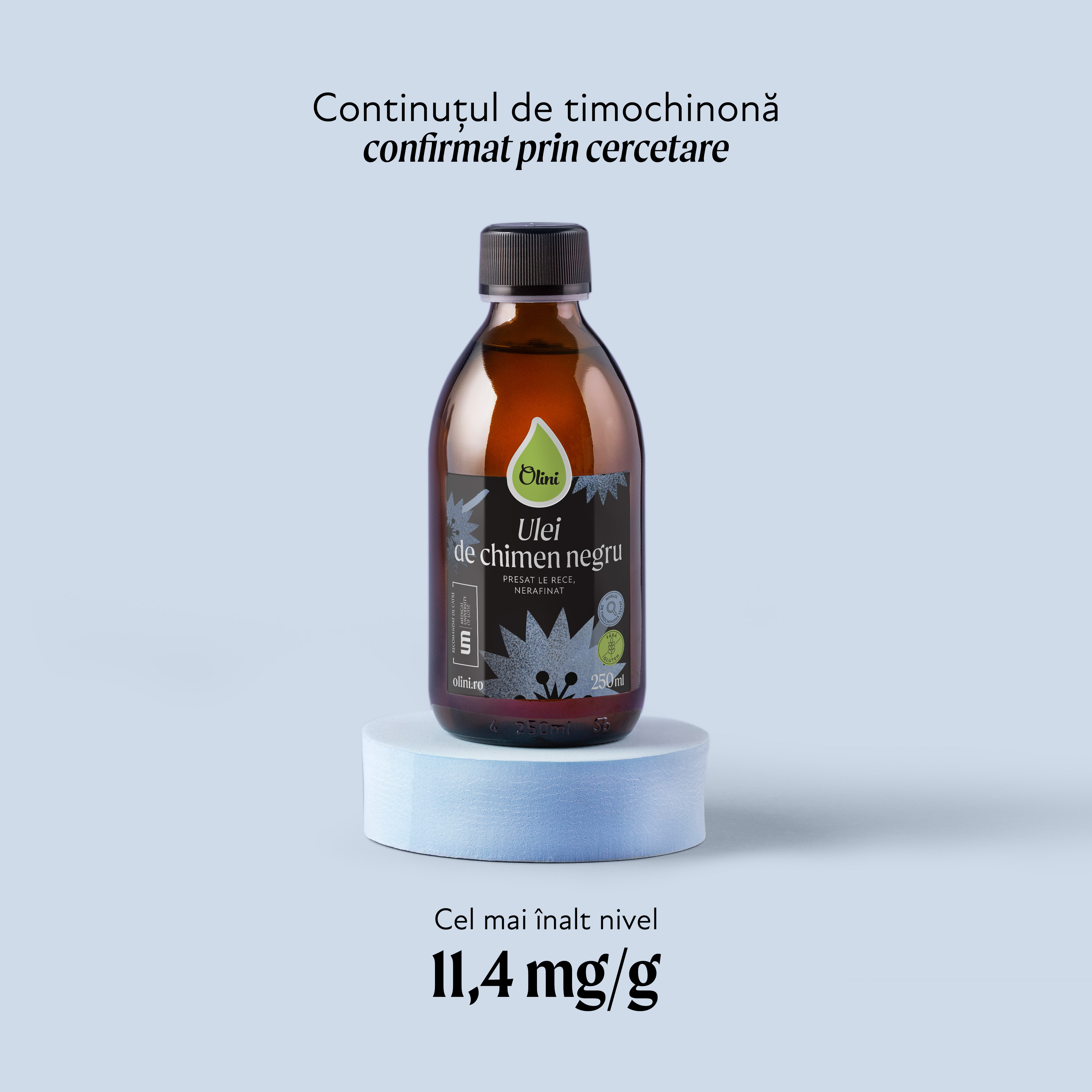 Un element esențial care face diferența în cazul uleiului de chimen negru este timochinona – un compus activ cu efect antioxidant puternic. Aceasta contribuie la protecția celulelor împotriva stresului oxidativ și are un rol important în reducerea inflamațiilor. Studiile arată că timochinona poate susține sănătatea ficatului, a plămânilor și a sistemului cardiovascular, făcând din uleiul de chimen negru presat la rece un supliment valoros pentru organism.